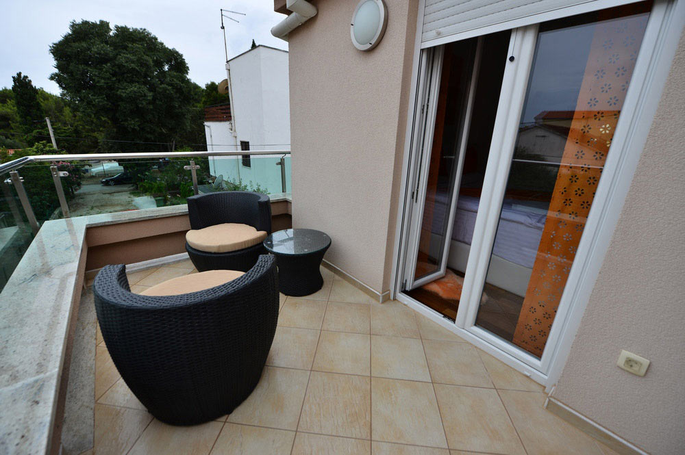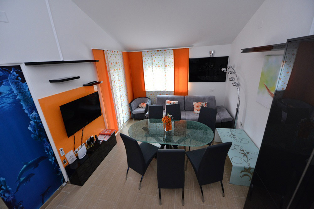 Apartman je veličine 70 m2. Nalazi se na katu, ima besplatan Wi-Fi te fiksni telefon u dnevnom boravku i kupaonici. Kuhinja je povezana sa blagavaonicom i dnevnim boravkom, te izlaznom terasom. Imaju dvije spavaće sobe koje imaju izlazak na odvojene terase.